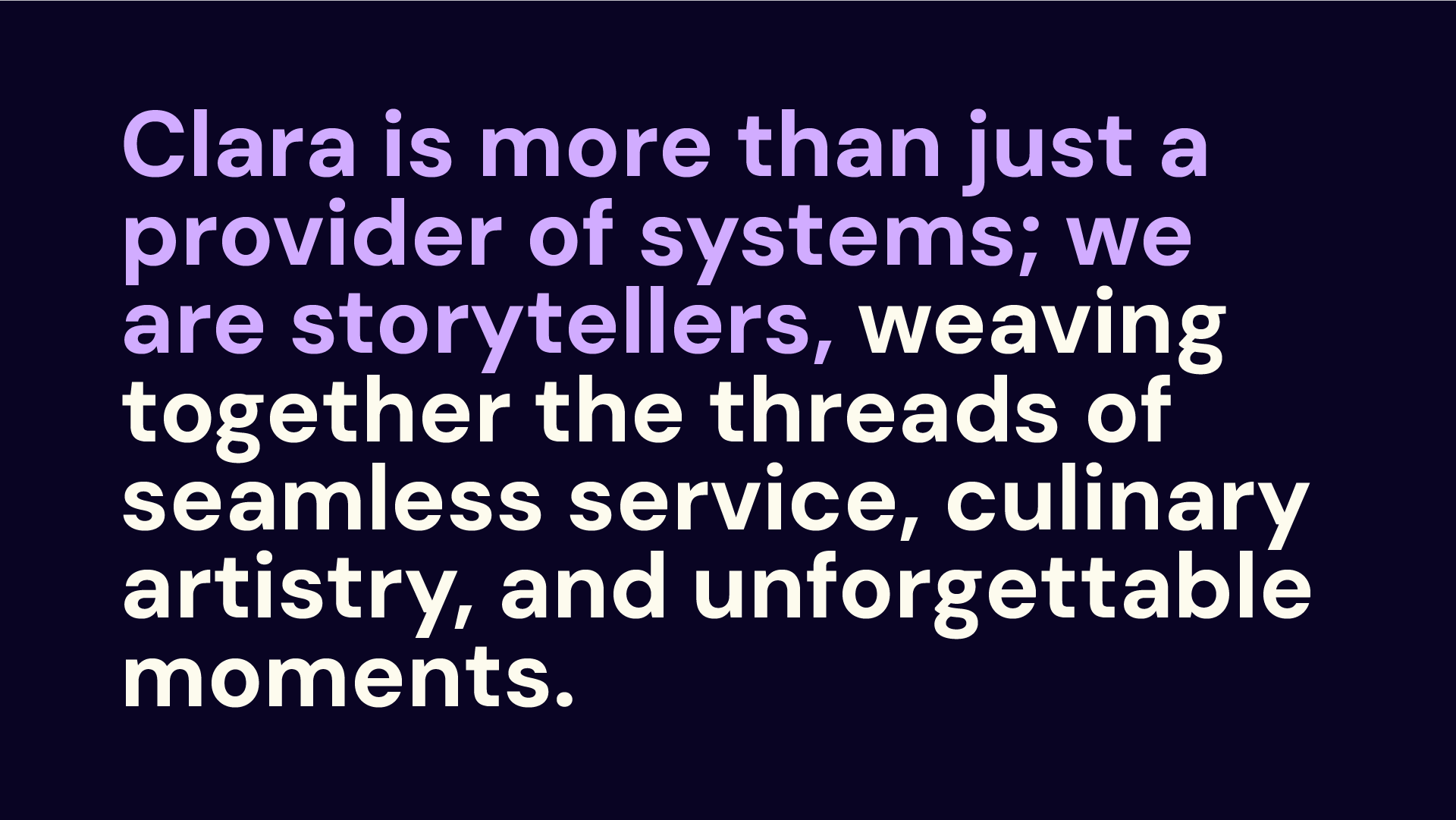 Two key words from the brand discovery were "focus" and "organized chaos". "Focus" because Clara helps both the restaurant and its patrons prioritize what's most important, creating and enjoying a great experience, by clarifying the processes. "Organized chaos" because Clara assists you in navigating the complexities of managing a busy restaurant.